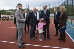 Gdańsk Chełm, ul. Reformacka. Otwarcie boiska wielofunkcyjnego przy Szkole Podstawowej nr 47. Nz. o lewej: Wiceprzewodniczący Rady Miasta Gdańska Wojciech Błaszkowski, Radny Miasta Gdańska Marek Bumblis, Prezydent Gdańska Paweł Adamowicz z córką Teresą, Dyrektor SP 47 Barbara Deptała