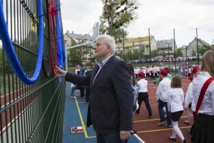 Gdańsk Chełm, ul. Reformacka. Otwarcie boiska wielofunkcyjnego przy Szkole Podstawowej nr 47. Nz. Dyrektor Naczelny Dyrekcji Rozbudowy Gdańska Włodzimierz Bartosiewicz