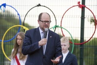 Gdańsk Chełm, ul. Reformacka. Otwarcie boiska wielofunkcyjnego przy Szkole Podstawowej nr 47. Nz. Prezydent Gdańska Paweł Adamowicz