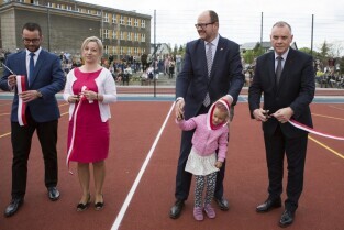 Gdańsk Chełm, ul. Reformacka. Otwarcie boiska wielofunkcyjnego przy Szkole Podstawowej nr 47. Nz. od lewej: Dyrektor Wydział Rozwoju Społecznego UMG Grzegorz Szczuka, Przewodnicząca Rady Rodziców SP 47 Anna Rożek, Prezydent Gdańska Paweł Adamowicz z córką Teresą, Dyrektor Naczelny Dyrekcji Rozbudowy Gdańska Włodzimierz Bartosiewicz