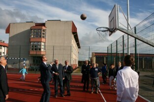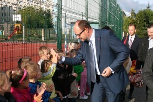 Gdańsk, Orunia Górna. Otwarcie nowego boiska do piłki ręcznej i koszykówki przy Zespole Kształcenia Podstawowego i Gimnazjalnego nr 6 przy ul. Hoena. Nz. Prezydent Gdańska Paweł Adamowicz