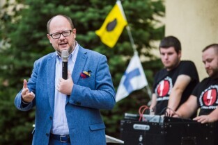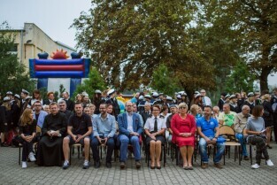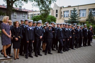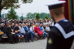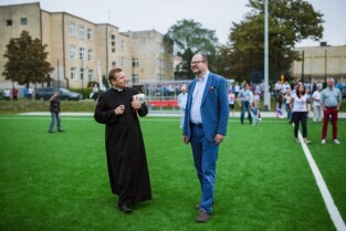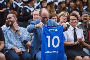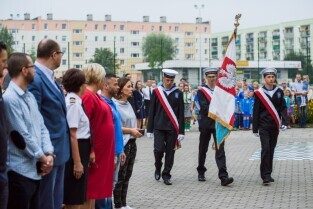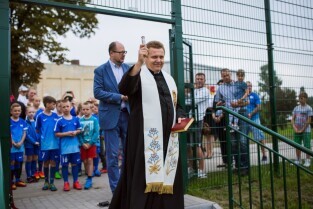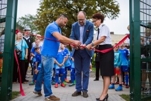 Uroczyste otwarcie boiska Zespołu Szkół Morskich. Nowy Port. Nz od lewej radna Beata Dunajewska, Ks. Paweł Górny, radny Łukasz Hamadyk, Grzegorz Szczuka, prezydent Adamowicz, dyrektor ZSM Hanna Szkodo, dyrektor IVLO Elżbieta Januszewska, trener Portowca Jacek Malko.