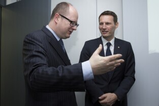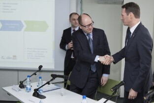 Otwarcie centrum finansowo - księgowego Bayera. Gdańsk, Olivia Tower przy al. Grunwaldzkiej. Nz. od lewej: Dyrektor Service Center Gdańsk, Bayer Sp. z o.o. Remigiusz Wojciechowski, Prezydent Gdańska Paweł Adamowicz