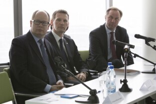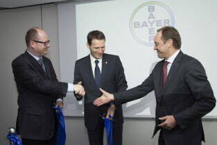 Otwarcie centrum finansowo - księgowego Bayera. Gdańsk, Olivia Tower przy al. Grunwaldzkiej. Nz. od lewej: Prezydent Gdańska Paweł Adamowicz, Prezes Bayer Sp. z o.o. Christophe Domont, Marszałek Woj. Pomorskiego Mieczysław Struk