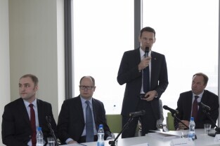 Otwarcie centrum finansowo - księgowego Bayera. Gdańsk, Olivia Tower przy al. Grunwaldzkiej. Nz. od lewej: Dyrektor Service Center Gdańsk, Bayer Sp. z o.o. Remigiusz Wojciechowski, Prezydent Gdańska Paweł Adamowicz, Prezes Bayer Sp. z o.o. Christophe Domont, Marszałek Woj. Pomorskiego Mieczysław Struk