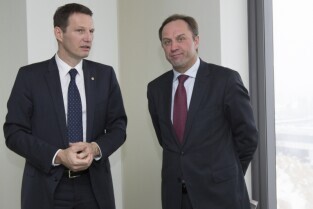 Otwarcie centrum finansowo - księgowego Bayera. Gdańsk, Olivia Tower przy al. Grunwaldzkiej. Nz. od lewej: Prezydent Gdańska Paweł Adamowicz i Prezes Bayer Sp. z o.o. Christophe Domont