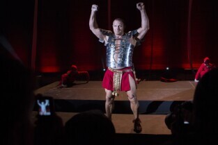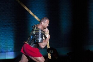 Gdańsk, Główne Miasto. Happening "Pierwsze Publiczne Otwarcie Dachu Gdańskiego Teatru Szekspirowskiego". Nz. Strongman Mariusz Pudzianowski
