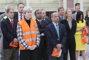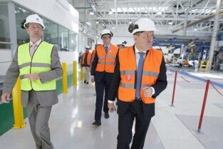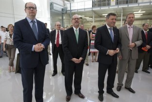 Gdańsk Kokoszki. Otwarcie fabryki przetwórstwa włókien sieciowanych Weyerhaeuser Poland. Nz. od lewej: Prezes Weyerhaeuser Company Daniel S. Fulton, Prezydent Gdańska Paweł Adamowicz, Wicepremier RP Janusz Piechociński