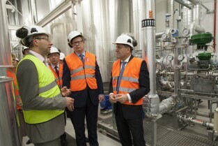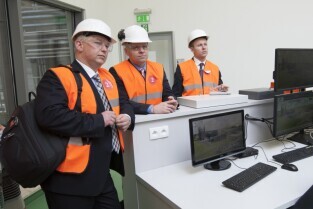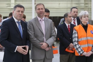 Gdańsk Kokoszki. Otwarcie fabryki przetwórstwa włókien sieciowanych Weyerhaeuser Poland. Nz. od lewej: Dyrektor Fabryki Weyerhaeuser Poland Tomasz Włodarczak, Wicepremier RP Janusz Piechociński, Prezydent Gdańska Paweł Adamowicz