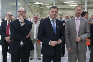 Gdańsk Kokoszki. Otwarcie fabryki przetwórstwa włókien sieciowanych Weyerhaeuser Poland. Nz. od lewej: Prezydent Gdańska Paweł Adamowicz, Wicepremier RP Janusz Piechociński, Dyrektor Fabryki Weyerhaeuser Poland Tomasz Włodarczak