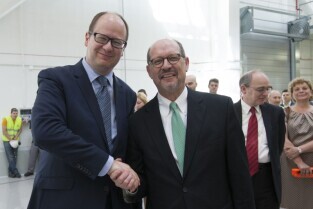 Gdańsk Kokoszki. Otwarcie fabryki przetwórstwa włókien sieciowanych Weyerhaeuser Poland. Nz. od lewej: Prezydent Gdańska Paweł Adamowicz i Wicepremier RP Janusz Piechociński