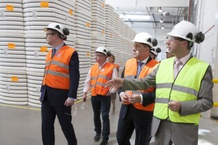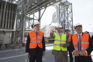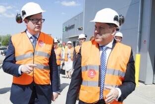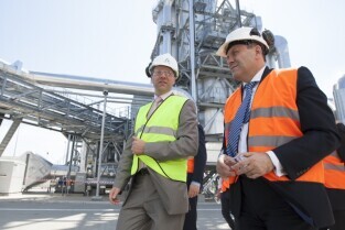 Gdańsk Kokoszki. Otwarcie fabryki przetwórstwa włókien sieciowanych Weyerhaeuser Poland. Nz. Wicepremier RP Janusz Piechociński, po lewej Dyrektor Fabryki Weyerhaeuser Poland Tomasz Włodarczak