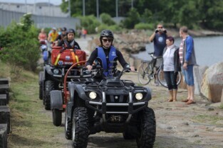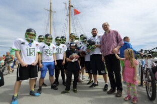 Gdansk Nowy Port. Otwarcie Falochronu dla Spacerowiczów. Nz Prezydent Gdańska Paweł Adamowicz z lewej z zespołem fitbolu amerykańskiego Wikingowie Gdańsk