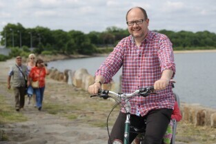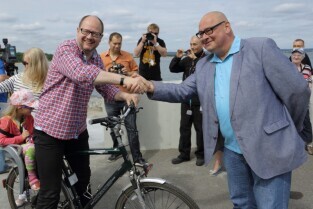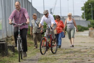 Gdansk Nowy Port. Otwarcie Falochronu dla Spacerowiczów. Nz jadą na rowerach od prawej Prezydent Gdańska Paweł Adamowicz i Marek Pietruszewski wice prezes ds finansowych Morskiego Portu Gdańsk