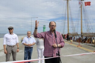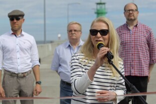 Gdansk Nowy Port. Otwarcie Falochronu dla Spacerowiczów. Przemawia Dorota Raben prezes zarzadu Morskiego Portu Gdańsk