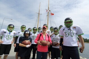Gdansk Nowy Port. Otwarcie Falochronu dla Spacerowiczów. Nz Poseł Iwona Guzowska z zespołem futbolu amerykańskiego Wikingowie Gdańsk