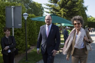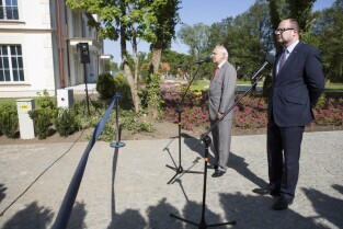 Gdańsk Oliwa. Otwarcie zrekonstruowanych przez Korporację Budowlaną DORACO dworku i folwarku Saltzmanna, znajdujących się w północnej części Parku Oliwskiego przy ul. Opackiej. Nz. po środku Z-ca Prezydenta Gdańska Wiesław Bielawski