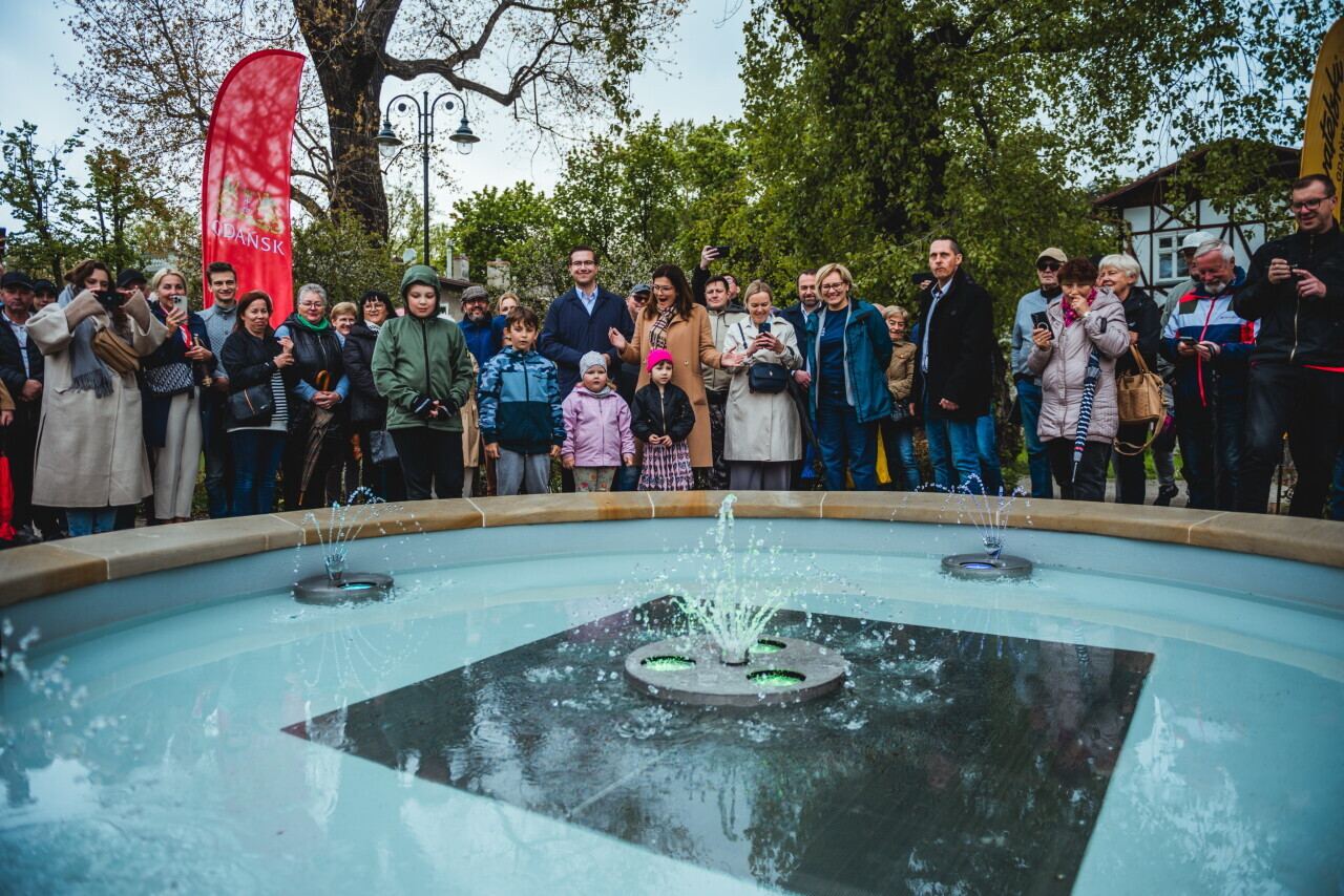 Gdańsk. Prezydent Aleksandra Dulkiewicz oraz radni miasta Katarzyna Czerniewska i Cezary Śpiewak-Dowbór wzięli udział w uroczystym otwarciu fontanny obok Domu Zdrojowego w Brzeźnie