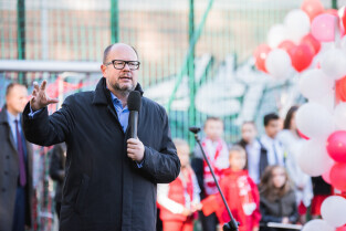 Gdańsk, ZSO Nr 10. Otwarcie setnego boiska. Nz. Prezydent Gdańska Paweł Adamowicz