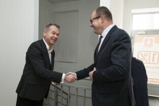 Gdańsk, ul. Nowe Ogrody. Otwarcie siedziby Fundacji "Żyć z Pompą". Nz. aktor Mirosław Baka i Prezydent Gdańska Paweł Adamowicz