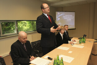 Otwarcie siedziby Gdańskiej Agencji Rozwoju Gospodarczego. Gdańsk, biurowiec K5 przy ul. Kartuskiej. Nz. od lewej: Alan Aleksandrowicz (Prezes Gdańskiej Agencji Rozwoju Gospodarczego), Paweł Adamowicz (Prezydent Gdańska), Joanna Wolff (Polska Agencja Informacji i Inwestycji Zagranicznych), Marcin Piątkowski (Centrum Obsługi Inwestora w Agencji Rozwoju Pomorza)