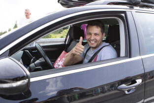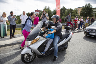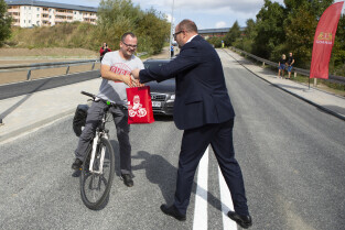 Gdańsk Chełm. Ponowne otwarcie ulicy Wilanowskiej, którą przebudowano w związku z budową tunelu w ciągu Jaru Wilanowskiego. Nz. Z Prezydent Gdańska Paweł Adamowicz wręcza upominki pierwszym kierowcom