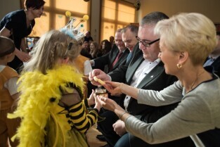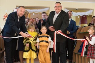 Otwarcie wyremontowanego, przebudowanego przedszkola nr 85 na gdańskim Chełmie. Uroczystego przecięcia wstęgi wraz z dziećmi dokonali Wiceprezydent Gdańska Piotr Kowalczuk oraz Włodzimierz Bartosiewicz - dyrektor naczelny Dyrekcji Rozbudowy Miasta Gdańska