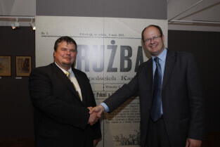 W ramach X Zjazdu Kaszubów w Gdańsku w Ratuszu Głównego Miasta otwarto dwie wystawy: "Kaszubi w Gdańsku" i "Kaszubi w Kanadzie". Nz. Artur Jabłoński i Paweł Adamowicz na tle reprodukcji kaszubskiego dodatku do Gazety Gdańskiej z 6 maja 1905 r.