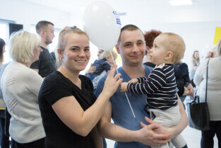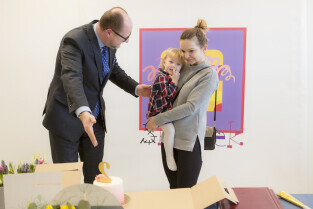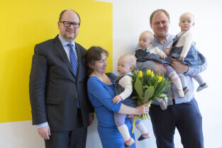 Otwarcie nowego żłobka "Skarbek" przy Kolorowej w Gdańsku. Nz. Prezydent Gdańska Paweł Adamowicz i rodzice z trojaczkami, którzy będą uczęszczać do żłobka