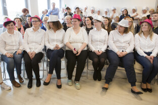 Otwarcie nowego żłobka "Skarbek" przy Kolorowej w Gdańsku. Nz. Prezydent Gdańska Paweł Adamowicz i opiekunki ze żłobka