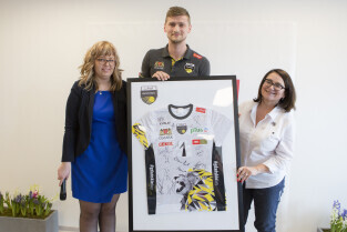 Otwarcie nowego żłobka "Skarbek" przy Kolorowej w Gdańsku. Nz. zawodnik Trefla Gdańsk Piotr Nowakowski i Dyrektor Gdańskiego Zespołu Żłobków Krystyna Konieczny (po prawej)
