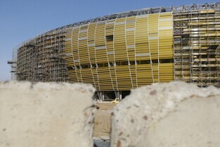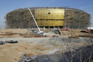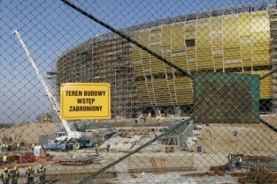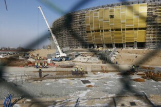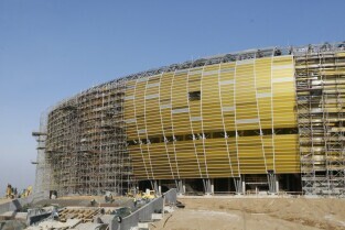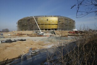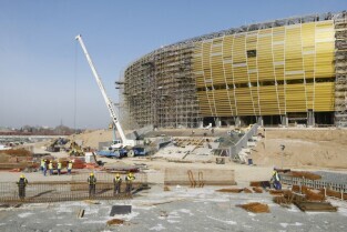 Gdańsk Letnica. Budowa stadionu PGE Arena. Została już odsłonięta część "burszynowej" elewacji.