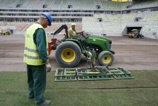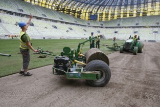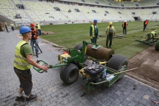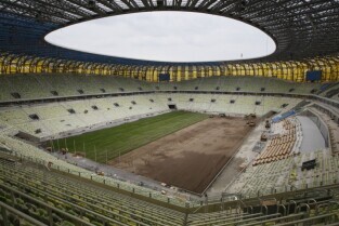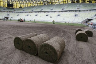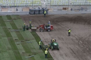 Gdańsk Letnica. Budowa stadionu piłkarskiego PGE Arena. Nz. ułożona została już połowa murawy