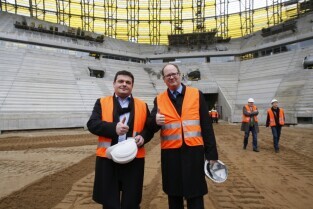 PGE Arena Gdańsk. Wizyta na stadionie prezydenta Gdańska wraz z jego najbliższymi współpracownikami. Nz. (od prawej) prezes BIEG Ryszard Trykosko i Prezydent Gdańska Paweł Adamowicz.