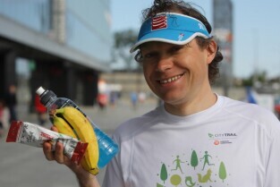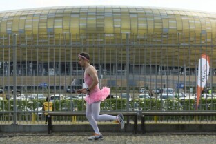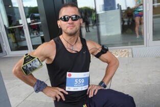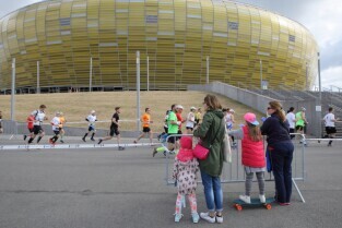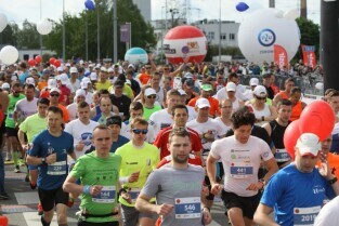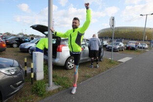Gdańsk. Druga edycja PZU Gdańsk Maraton. Trasa przebiegała ulicami miasta. Pierwszy linię mety, usytuowaną w Amber Expo minął Paweł Piotraschke. Nz Adam Korol w białej koszulce z napisem - Irek maraton o życie.