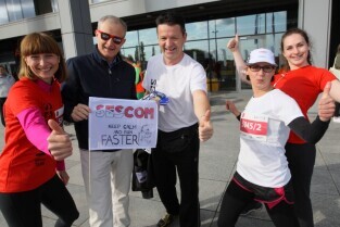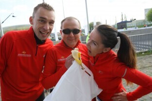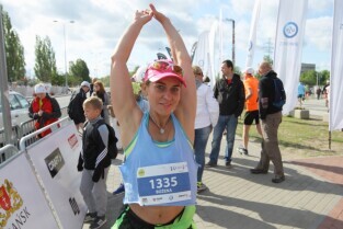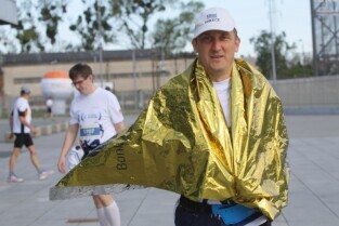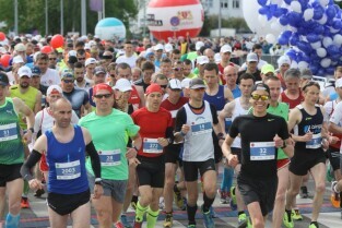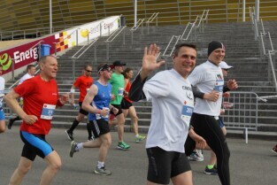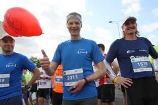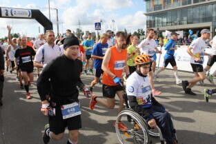 Gdańsk. Druga edycja PZU Gdańsk Maraton. Trasa przebiegała ulicami miasta. Pierwszy linię mety, usytuowaną w Amber Expo minął Paweł Piotraschke. Nz Adam Korol (w środku w białej koszulce z napisem - Irek maraton o życie)