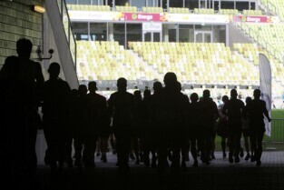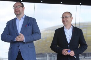 Gdańsk. Druga edycja PZU Gdańsk Maraton. Trasa przebiegała ulicami miasta. Pierwszy linię mety, usytuowaną w Amber Expo minął Paweł Piotraschke. Nz Prezydent Gdańska Paweł Adamowicz i Leszek Paszkowski, dyrektor Miejskiego Ośrodka Sportu i Rekreacji w Gdańsku.