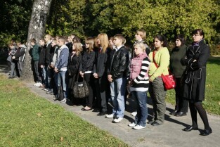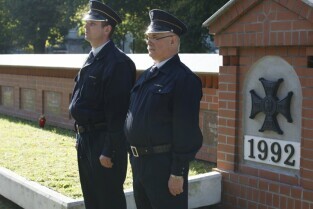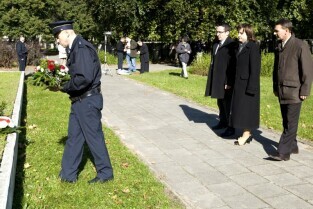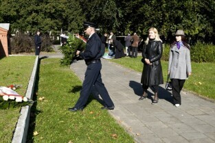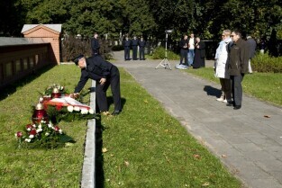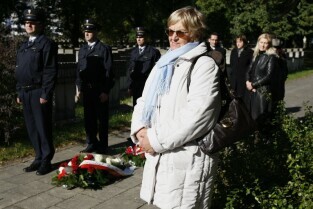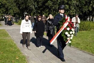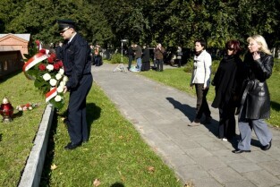 Apel poległych, modlitwa i złożenie kwiatów przy kwaterze pomordowanych Obrońców Poczty Polskiej. Gdańsk, Cmentarz na Zaspie