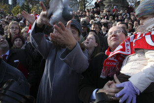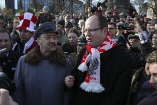 Parada Niepodległości w Gdańsku w 90-tą rocznicę odzyskania przez Polskę niepodległości. Nz. Prezydent Gdańska Paweł Adamowicz z aktorem odgrywającym rolę Józefa Piłsudskiego