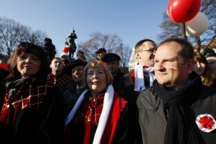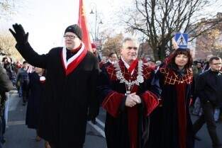 IX Parada Niepodległości ulicami Starego Miasta w Gdańsku zorganizowana w 93. rocznicę odzyskania przez Polskę niepodleglości. Nz. od prawej: Minister Edukacji Katarzyna Hall, gdański radny Piotr Grzelak, Prezydent Gdańska Paweł Adamowicz, Przewodniczący Rady Miasta Gdańska Bogdan Oleszek