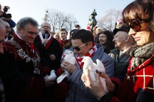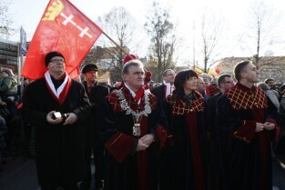 IX Parada Niepodległości ulicami Starego Miasta w Gdańsku zorganizowana w 93. rocznicę odzyskania przez Polskę niepodleglości. Nz. od lewej: Prezydent Gdańska Paweł Adamowicz, Marszałek Woj. Pomorskiego Mieczysław Struk, Przewodniczący Rady Miasta Gdańska Bogdan Oleszek, gdańscy radni Żaneta Geryk i Piotr Borawski