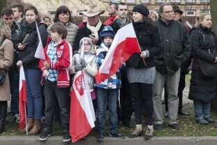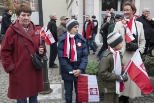 Gdańsk. Parada Niepodległości ulicami Starego Miasta w 95. rocznicę odzyskania przez Polskę niepodległości. Nz. od lewej Radne Miasta Gdańska: Żaneta Geryk i Aleksandra Dulkiewicz z córką Zofią