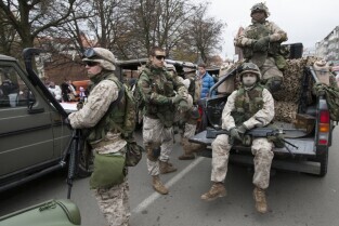 Gdańsk. Parada Niepodległości ulicami Starego Miasta w 95. rocznicę odzyskania przez Polskę niepodległości. Nz. od lewej: Radny Miasta Gdańska Piotr Gierszewski, Przewodniczący Rady Miasta Gdańska Bogdan Oleszek i organizator parady Adam Hlebowicz