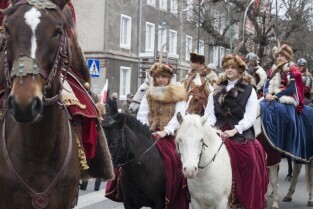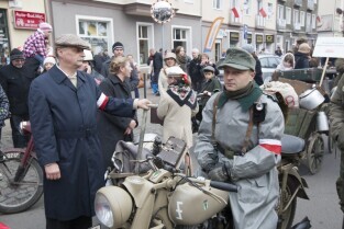Gdańsk. Parada Niepodległości ulicami Starego Miasta w 95. rocznicę odzyskania przez Polskę niepodległości. Nz. organizator parady Lech Parell i Radna Miasta Gdańska Żaneta Geryk