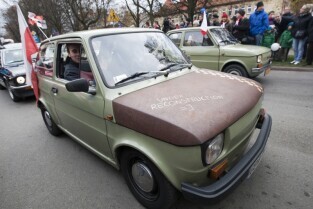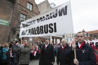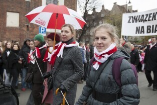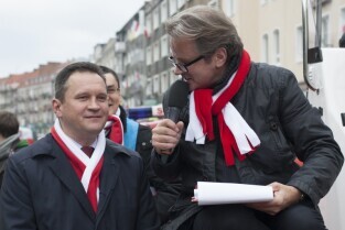 Gdańsk. Parada Niepodległości ulicami Starego Miasta w 95. rocznicę odzyskania przez Polskę niepodległości. Nz. Wicemer Wilna Jaroslav Kaminski (po lewej) i prowadzący paradę Michał Juszczakiewicz