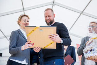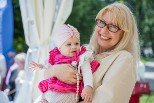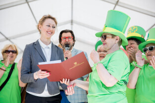 Gdańsk, Ołowianka. Parada i Piknik Seniorów 2022 w Gdańsku. Nz. Wicemarszałek województwa Pomorskiego Agnieszka Kapała-Sokalska i Tomasz Pogonowski współtworzący Fundację Pomagamy, Nie Ziewamy