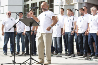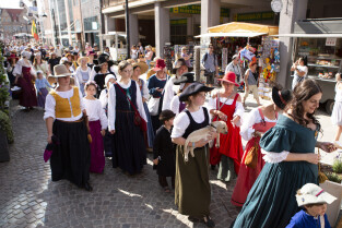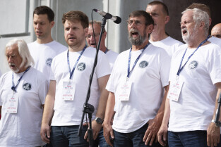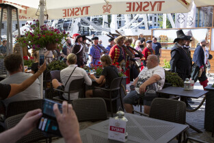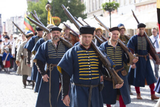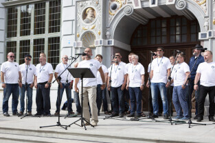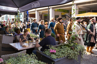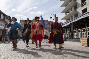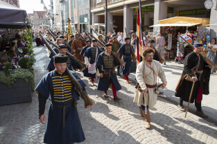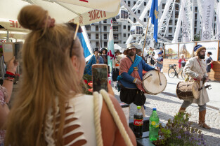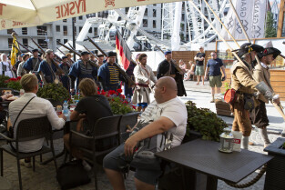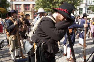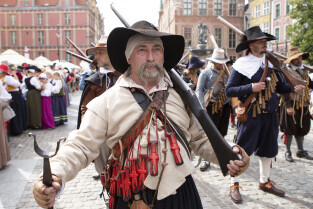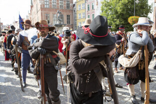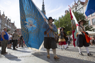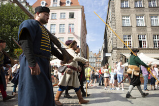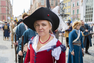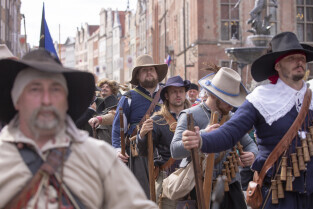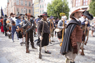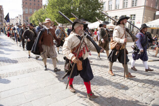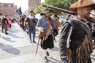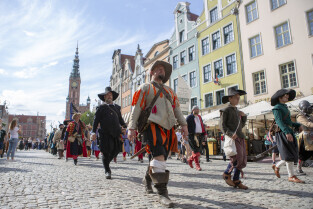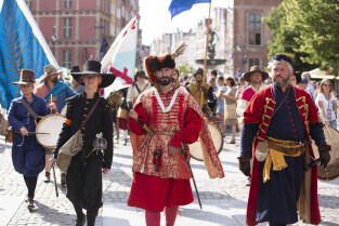 Muzyczna parada żeglarzy i rekonstruktorów załogi Twierdzy Wisłoujście spod Dworu Artusa na Wyspę Ołowiankę z okazji oficjalnego otwarcia Zlotu Żaglowców Baltic Sail