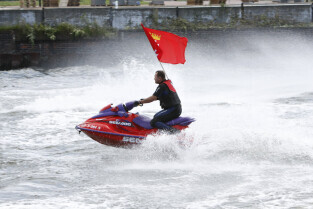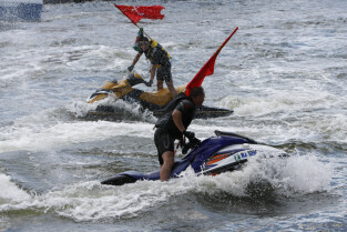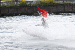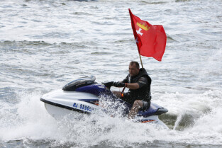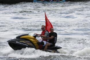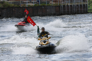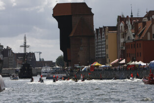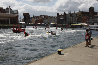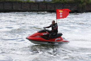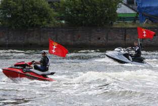 Parada skuterów wodnych i motorówek na Motławie przystrojonych w Gdańskie flagi.