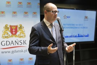 Podpisanie "Partnerstwa na rzecz zrównoważonego rozwoju” pomiędzy EDF Polska S.A., a miastem Gdańsk. Europejskie Centrum Solidarności w Gdańsku. Nz. Prezydent Gdańska Paweł Adamowicz