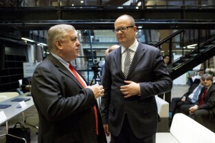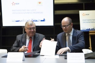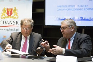 Podpisanie "Partnerstwa na rzecz zrównoważonego rozwoju” pomiędzy EDF Polska S.A., a miastem Gdańsk. Europejskie Centrum Solidarności w Gdańsku. Nz. Przewodniczący Rady Nadzorczej EDF Polska S.A. Gerard Roth i Prezydent Gdańska Paweł Adamowicz